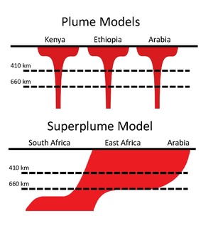 Over time, many theories have tried to clarify the evolution of the East African Rift. In 1972 it was proposed that the EAR was not caused by tectonic activity, but rather by differences in crustal density. Since the 1990s, evidence has been found in favor of mantle plumes beneath the EAR.[10] Others proposed an African superplume causing mantle deformation.[11][12][13] Although the effects of deep-rooted mantle plumes are an important hypothesis, their location and dynamics are poorly understood, and a matter of active research.[14] The question is still debated.