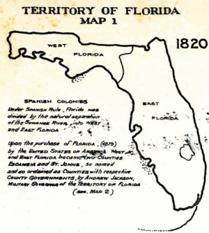 Under Spanish rule, Florida was divided by the natural separation of the Suwanee River into West Florida and East Florida. Upon the purchase of Florida, (1819) by the United States of America, West Florida and East Florida became two counties: Escambia County and St Johns County, so named and so ordained as counties with respective county governments by Andrew Jackson, Military Governor of the Territory of Florida.