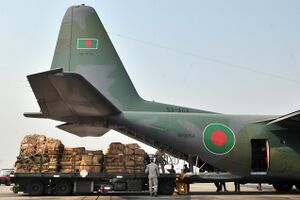 US Air Force personnel unloading relief supplies from a Bangladesh Air Force C130 plane in Kathmandu, Nepal