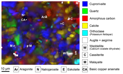 - ^ Petra Dariz; Thomas Schmid (2022). "Raman focal point on Roman Egyptian blue elucidates disordered cuprorivaite, green glass phase and trace compounds". Scientific Reports. 12 (15596): 15596. Bibcode:2022NatSR..1215596D. doi:10.1038/s41598-022-19923-w. ISSN 2045-2322. PMC 9481618. PMID 36114229.
