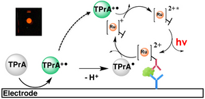 It generally uses Ruthenium complexes, especially [Ru(bpy)3]2+ (bpy = 2,2'-bipyridine) which releases a photon at ~620 nm regenerating with TPrA (Tripropylamine) in liquid phase or liquid–solid interface. It can be used as monolayer immobilized on an electrode surface (made e.g. of nafion, or special thin films made by Langmuir–Blogett technique or self-assembly technique) or as a coreactant or more commonly as a tag and used in HPLC, Ru tagged antibody based immunoassays, Ru Tagged DNA probes for PCR etc., NADH or H2O2 generation based biosensors, oxalate and organic amine detection and many other applications and can be detected from picomolar sensitivity to dynamic range of more than six orders of magnitude. Photon detection is done with photomultiplier tubes (PMT) or silicon photodiode or gold coated fiber-optic sensors. The importance of ECL techniques detection for bio-related applications has been well established.[9] ECL is heavily used commercially for many clinical lab applications.[10][11][12]