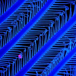 في الصورة: First degree filter setae with V-shaped second degree setae pointing towards the داخل feeding basket. الكرة البنفسجية قطرها 1 µm.