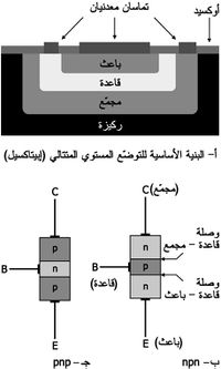 يبين الشكل 4-أ البنية الأساسية لأحد أنواع الترانزيستورات ذات البنية المتكاملة، بينما يبين الشكلان 4 - ب، جـ شكلًا مبسطاً لكلا النوعين npn,pnp. ويظهر في الشكلين 5 - أ، ب الرمزان الكهربائيان لهذين النوعين من الترانزيستورات.