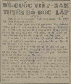 Emperor Bảo Đại declared the Treaty of Huế made with France in 1884 void. Trần Trọng Kim, a renowned historian and scholar, was chosen to lead the government as prime minister.[4]