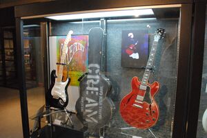 Clapton first visited the United States while touring with Cream. In March 1967, Cream performed a nine-show stand at the RKO Theater in New York. Clapton's 1964 painted Gibson SG guitar – The Fool – a "psychedelic fantasy", according to Clapton,[36] made its debut at the RKO Theater. Clapton used the guitar for most of Cream's recordings after Fresh Cream, particularly on Disraeli Gears, until the band broke up in 1968.[37] One of the world's best-known guitars, it symbolises the psychedelic era.[37] They recorded Disraeli Gears in New York from 11 to 15 May 1967. Cream's repertoire varied from hard rock ("I Feel Free") to lengthy blues-based instrumental jams ("Spoonful"). Disraeli Gears contained Clapton's searing guitar lines, Bruce's soaring vocals and prominent, fluid bass playing, and Baker's powerful, polyrhythmic jazz-influenced drumming. Together, Cream's talents secured them as an influential power trio. Clapton's voice can be heard on Frank Zappa's album We're Only in It for the Money, on the tracks "Are You Hung Up?" and "Nasal Retentive Calliope Music".