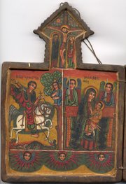 هذه الأيقونة الإثيوبية تظهر القديس جرجس، مشهد الصلب، ومريم العذراء.