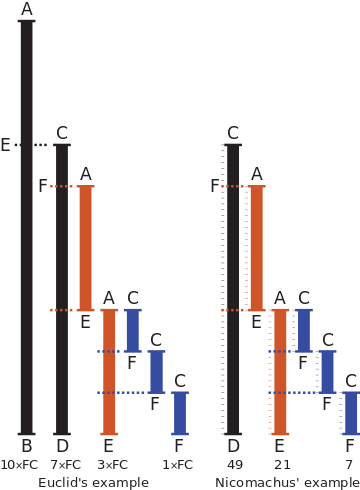 The algorithm was probably not discovered by Euclid, who compiled results from earlier mathematicians in his Elements.[26][27] The mathematician and historian B. L. van der Waerden suggests that Book VII derives from a textbook on number theory written by mathematicians in the school of Pythagoras.[28] The algorithm was probably known by Eudoxus of Cnidus (about 375 BC).[25][29] The algorithm may even pre-date Eudoxus,[30][31] judging from the use of the technical term ἀνθυφαίρεσις (anthyphairesis, reciprocal subtraction) in works by Euclid and Aristotle.[32] Claude Brezinski, following remarks by Pappus of Alexandria, credits the algorithm to Theaetetus (c. 417 – c. 369 BC).[33]