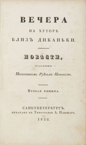 أمسيات بمزرعة بالقرب من ديكانكا (روسية: «Вечера на хуторе близ Диканьки») is a collection of short stories by Nikolai Gogol, written in 1829–1832. They appeared in various magazines and were published in book form when Gogol was twenty-two. The collection's frame story takes place in Dykanka, a settlement in central Ukraine.