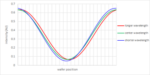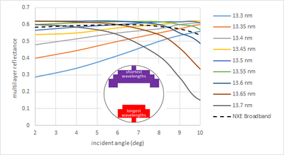 على عكس مصادر ليثوغرافيا DUV، استناداً إلى ليزر الإكسيمر، تنتج مصادر الپلازما EUV الضوء عبر نطاق واسع من الأطوال الموجية.[73] على الرغم من أن طيف الأشعة فوق البنفسجية ليس أحادي اللون تماماً، ولا حتى نقياً من الناحية الطيفية مثل مصادر الليزر DUV، فقد تم أخذ الطول الموجي العامل عموماً ليكون 13.5 نانومتر. في الواقع، يتم توزيع الطاقة المنعكسة في الغالب في نطاق 13.3-13.7 نانومتر.[74] يزيد عرض النطاق الترددي لضوء EUV المنعكس بواسطة مرآة متعددة الطبقات المستخدمة في الليثوغرافيا EUV عن +/- 2٪ (> 270 م);[75] يمكن حساب تغيرات الطور بسبب تغيرات الطول الموجي عند زاوية إضاءة معينة[76] ومقارنة بميزانية الانحراف.[77] الاعتماد على الطول الموجي لـ الانعكاس[76][74] يؤثر أيضاً على apodization، أو توزيع الإضاءة عبر البؤرة (لزوايا مختلفة)؛ الأطوال الموجية المختلفة "تدرك" الإضاءات المختلفة بشكل فعال حيث تنعكس بشكل مختلف بواسطة الطبقات المتعددة للقناع.[78][74] يمكن أن تؤدي هذة الإمالة الفعالة لإضاءة المصدر إلى تحولات كبيرة في الصورة بسبب إلغاء الضبط البؤري.[79] على العكس من ذلك، يختلف الطول الموجي المنعكس للذروة عبر البؤرة بسبب زوايا الحوادث المختلفة.[74][80]ويتفاقم هذا عندما تمتد الزوايا في نصف قطر واسع، على سبيل المثال، الإضاءة الحلقيّة. يزيد الطول الموجي لقمّة الانعكاس بالنسبة لزوايا سقوط أصغر.[81] تم اقتراح طبقات متعددة غير دورية لتقليل الحساسية بتكلفة انعكاسية منخفضة ولكنها حساسة للغاية للتقلبات العشوائية في سماكة الطبقة، مثل عدم دقة التحكم في السماكة أو الانتشار الداخلي.[82] على وجه الخصوص، فإن الخطوط الكثيفة غير المركزة عند الاهتزازات التي تصل إلى ضعف الحد الأدنى من درجة الاهتزاز القابلة للفصل تعاني من تغيرات الحافة التي تعتمد على الطول الموجي.[83]