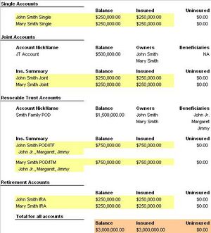Each ownership category of a depositor's money is insured separately up to the insurance limit, and separately at each bank. Thus a depositor with $250,000 in each of three ownership categories at each of two banks would have six different insurance limits of $250,000, for total insurance coverage of $1,500,000.[22] The distinct ownership categories are:[22]