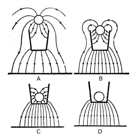 Drawing of the electric field lines as the charged ball is lowered into the container (A,B). When the charge is far enough inside (C), all the electric field lines terminate on the inside of the container, inducing an equal charge there. When the ball is touched to the inside of the container (D), all the charge moves to the pail.