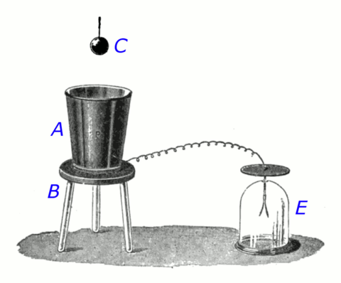 Apparatus Faraday used in the experiment: a metal pail (A) is supported on a wooden stool (B) to insulate it from the ground. A metal ball (C) charged with static electricity can be lowered into the pail on a nonconducting silk thread. A gold-leaf electroscope (E), a sensitive detector of electric charge, is attached by a wire to the outside of the pail. When the charged ball is lowered into the pail without touching it, the electroscope registers a charge, indicating that the ball induces charge in the metal container by electrostatic induction. An opposite charge is induced on the inside surface of the pail.