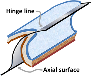 - محور الطية Fold Axis: هو الخط الواقع على قمة سطح الطبقة المطوية والذي يصل بين النقاط التي يبلغ عندها انحناء سطح الطبقة أقصاه. ويسمى محور الطية كذلك خط المفصل.