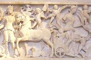 تلوس ماتر، النظيرة الرومانية لگايا، تترجل من عربتها - من تفاصيل ناووس (تابوت حجري) في متحف Glyptotheck في ميونيخ