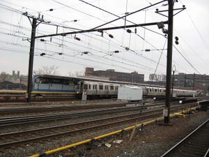 In 1949, the PRR discontinued its ferry system on the Hudson, and in 1961, it closed its Exchange Place station.[27] In 1963, due to declining traffic and revenue, the PRR demolished the above-ground New York Penn Station. It retained its below-ground passenger concourses and waiting areas, and sold its air rights, enabling construction of a new Madison Square Garden.[28] In 1967, the Aldene Plan was implemented, requiring the floundering Central Railroad of New Jersey (CNJ), Reading (RDG), and Lehigh Valley (LV) railroads, to travel into Newark Penn while continuing service to New York Penn.[23]:61[29] Under continued financial pressure, the PRR merged with New York Central (NYC) in 1968, but the newly-formed Penn Central (PC) declared bankruptcy on June 21, 1970. In 1976, the PC long-distance service (including part of today's Northeast Corridor and Empire Corridor) was assumed by Amtrak, which had been founded in 1971.[30] Conrail was created in 1976 to consolidate numerous Northeast private railroads, including commuter service on the CNJ and the LV.[31][32] Conrail divested itself from passenger operations in 1983, and NJT assumed control.[33]