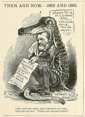 A cartoon by Bernhard Gillam depicting Grant courting Jewish voters in 1882 by crying "crocodile tears" over the persecution of Jews in Russia. The cartoon contrasts Grant's expressions of outrage with his own earlier actions.