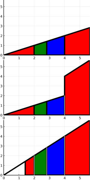 If r < 0, adjacent terms in the geometric series alternate between being positive and negative. A geometric interpretation of a converging alternating geometric series is shown in the adjacent diagram in which the areas of the negative terms are shown below the x axis. Pairing and summing each positive area with its negative smaller area neighbor results in non-overlapped trapezoids separated by gaps. To remove the gaps, broaden each trapezoid to cover the rightmost 1 - r2 of the original triangle area instead of just the rightmost 1 - |r|. However, to maintain the same trapezoid areas during this broadening transformation, scaling is needed: scale*(1 - r2) = (1 - |r|), or scale = (1 - |r|) / (1 - r2) = (1 + r) / (1 - r2) = (1 + r) / ((1 + r)(1 - r)) = 1 / (1 - r) where -1 < r ≤ 0. Note that because r < 0 this scale decreases the amplitude of the separated trapezoids in order to fill in the separation gaps. In contrast, for the case r > 0 the same scale 1 / (1 - r) increases the amplitude of the non-overlapped trapezoids in order to account for the loss of the overlapped areas.