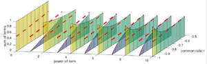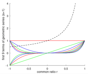 The rate of convergence also depends on the value of the common ratio r. Specifically, the rate of convergence gets slower as r approaches 1 or −1. For example, the geometric series with a = 1 is 1 + r + r2 + r3 + ... and converges to 1 / (1 - r) when |r| < 1. However, the number of terms needed to converge approaches infinity as r approaches 1 because a / (1 - r) approaches infinity and each term of the series is less than or equal to one. In contrast, as r approaches −1 the sum of the first several terms of the geometric series starts to converge to 1/2 but slightly flips up or down depending on whether the most recently added term has a power of r that is even or odd. That flipping behavior near r = −1 is illustrated in the adjacent image showing the first 11 terms of the geometric series with a = 1 and |r| < 1.