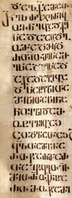 Asomtavruli (بالجورجية: ასომთავრული, ႠႱႭႫႧႠႥႰႳႪႨ; النطق الجورجي: []) is the oldest Georgian script. The name Asomtavruli means "capital letters", from aso (ასო) "letter" and mtavari (მთავარი) "principal/head". It is also known as Mrgvlovani (بالجورجية: მრგვლოვანი) "rounded", from mrgvali (მრგვალი) "round", so named because of its round letter shapes. Despite its name, this "capital" script is unicameral.[24]