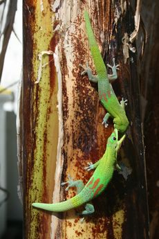 These day geckos feed on various insects and other invertebrates, and are also capable of eating other smaller lizards. They also eat soft, sweet fruit and pollen and nectar from flowers, often congregating in groups of many individuals to feed off of one plant.