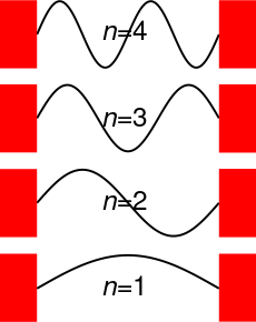 The wave function of the ground state of a particle in a one-dimensional box is a half-period sine wave, which goes to zero at the two edges of the well. The energy of the particle is given by , where h is the Planck constant, m is the mass of the particle, n is the energy state (n = 1 corresponds to the ground-state energy), and L is the width of the well.