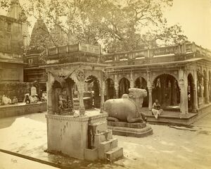 Visiting in September 1824, Reginald Heber found the plinth to be more revered than Ahilyabai's temple and filled with priests and devotees; the "well", fed by a subterranean channel of the Ganges, featured a stair for the devotees to descent and take a bath.[64] Four years later, Baiza Bai, widow of the Maratha ruler Daulat Rao Scindhia, constructed a pavilion around the well — reducing it in size —, and erected a colonnade to support a roof, pursuant to a proposal raised by member of a Peshwa family.[25][29] The colonnade was based on the Gyan Mandapa, mentioned in Kashikhand but the architectural style was borrowed from contemporary Mughal Baradaris.[س] To its east, was a statue of Nandi, which had been gifted by the Rana of Nepal.[66] To further east, a temple of Mahadeva was constructed by the Rani of Hyderabad.[66] In the south, two small shrines —one of marble, and the other of stone— existed.[66] The first legal dispute seem to have arose in 1854, when the local court rejected a plea to install a new idol in the complex.[67][ش] The same year, a Bengali pilgrim noted that Muslim guards were to be "either bribed or hoodwinked" to access the precincts.[59] M. A. Sherring[ص], writing in 1868, noted the Hindus to have claimed the plinth as well as the southern wall; the Muslims were allowed to exert control over the mosque but quite reluctantly, and permitted to only use the side entrance.[68][ض] A peepal tree overhanging the gateway was also venerated, and Muslims were not allowed to "pluck a single leaf from it."[59] In 1886, adjudicating on a dispute about illegal constructions, the District Magistrate held that unlike the mosque proper, which had belonged to the Muslims exclusively, the enclosure was a common space thereby precluding any unilateral and innovative use.[70]>[67] This principle would continue to decide multiple cases in the next few decades.[67][ط]