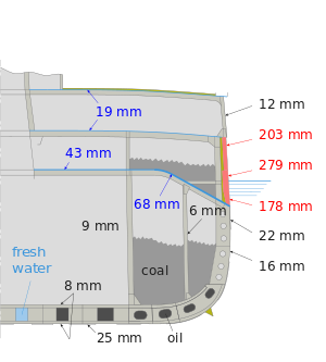 Dreadnought used Krupp cemented armour throughout, unless otherwise mentioned. Her waterline belt measured 11 in (279 mm) thick, but tapered to 7 in (178 mm) at its lower edge. It extended from the rear of 'A' barbette to the centre of 'Y' barbette. Oddly, it was reduced to 9 in (229 mm) abreast 'A' barbette. A 6 in (152 mm) extension ran from 'A' barbette forward to the bow and a similar 4 inch extension ran aft to the stern. An 8 in (203 mm) bulkhead was angled obliquely inwards from the end of the main belt to the side of 'X' barbette to fully enclose the armoured citadel at middle deck level. An 8-inch belt sat above the main belt, but only ran as high as the main deck. One major problem with Dreadnought's armour scheme was that the top of the 11 inch belt was only 2 ft (0.6 m) above the waterline at normal load and it was submerged by over 12 inches at deep load, which meant that the waterline was then protected only by the 8 inch upper belt.[32]