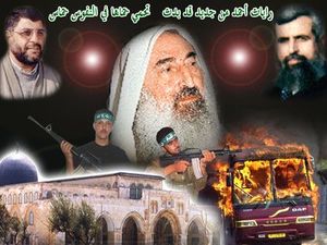 ملصق لحركة حماس يظهر عليه صورة الشيخ احمد ياسين، وعبد العزيز الرنتيسي، وصلاح شحادة واستشهاديين اثنين. كتب عليه أبيات من قصيدة "حماس": رايات أحمدَ من جديـد قـد بـدت تحمي حماهـا بالنفـوس حمـاس