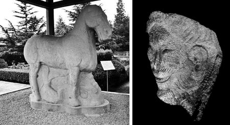 Tomb of Chinese general Huo Qubing (died 117 BC): statue of a horse stomping a Xiongnu warrior, with detail of the head of the vanquished Xiongnu warrior.[74][75]
