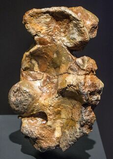 A large neck vertebra attributed to Hatzegopteryx is short and unusually robust. The preserved portion measures 240 mm (9.4 in) long, with the entire vertebra likely measuring 300 mm (12 in) long in life.[6] Pterosaurs had nine neck vertebrae.[13] Regression indicates that the third to seventh cervical vertebrae would have collectively measured 1.508 m (4 ft 11.4 in) in length, with the longest vertebra - the fifth - only measuring approximately 400 mm (16 in) long. Meanwhile, the same vertebrae in the similarly giant Arambourgiania measured 2.652 m (8 ft 8.4 in). This indicates that the neck of Hatzegopteryx is about 50–60% the length of what would be expected for a giant azhdarchid of its size.[8]