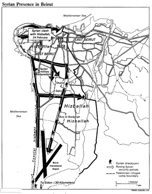 In May 1988, after years of rivalry and clashes, Hezbollah waged a brief but intense war with Amal for control of Beirut's southern suburbs,[47] which at the time contained about one-quarter of Lebanon's population.[40] As Amal was allied with Syria, Hezbollah clashed with the Syrian Army troops occupying Lebanon at that time. Hezbollah won in the streetfighting and escalated to targeted assassinations and encouraging defections, forcing Amal to seek Syrian mediation. Amal and Hezbollah have remained begrudging allies ever since.[48]