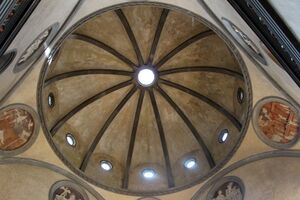 An aspiring competitor to Pisa, the city of Florence took the opposite side in the conflict between Pope and Emperor, siding with the Pope in Rome. This was reflected architecturally in the "proto-renaissance" style of its buildings.[76] The eight-sided Florence Baptistery, with its large octagonal cloister vault beneath a pyramidal roof, was likely built between 1059 and 1128, with the dome and attic built between 1090 and 1128. The lantern above the dome is dated to 1150.[77] It takes inspiration from the Pantheon in Rome for its oculus and much of its interior decoration, although the pointed dome is structurally similar to Lombard domes, such as that of the later Cremona Baptistery. Its ratio of wall thickness to external diameter is about 1/10, in accordance with the rules of dome proportion followed until the 17th century. One of the most important religious buildings in Florence, the proportions of its dome were followed by the nearby dome of the Cathedral of Santa Maria del Fiore that was built by Brunelleschi centuries later. The polygonal dome was built with a wooden tension ring at about 23 meters high, too high to counteract the spreading forces, and a lower iron ring was added in 1514.[78]