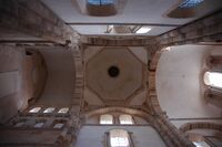 Domes in Romanesque architecture were generally found within crossing towers at the intersection of a church's nave and transept, which concealed the domes externally.[63] Called a tiburio, this tower-like structure often had a blind arcade near the roof.[66] Romanesque domes were typically octagonal in plan and used corner squinches to translate a square bay into a suitable octagonal base.[67] They were built across southern Europe in the 11th and 12th centuries and hundreds of examples under church crossing towers exist in Spain and southern France.[2]