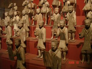 The Zhou dynasty (ح. 1056) had made the state of Qin in Western China as an outpost to breed horses and act as a defensive buffer against nomadic armies of the Rong, Qiang, and Di peoples.[2] After conquering six Warring States (i.e. Han, Zhao, Wei, Chu, Yan, and Qi) by 221 BCE,[2] the King of Qin, Ying Zheng, unified China under one empire divided into 36 centrally-controlled commanderies.[3] With control over much of China proper, he affirmed his enhanced prestige by taking the unprecedented title huangdi, or 'emperor', known thereafter as Qin Shi Huang (i.e. the first emperor of Qin).[3] Han-era historians would accuse his regime of employing ruthless methods to preserve his rule.[4]