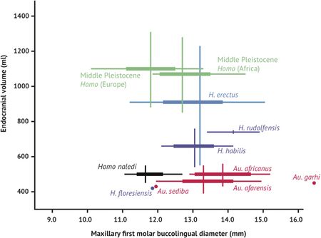 In 2013, fossil skeletons of Homo naledi, an extinct species of hominin assigned (provisionally) to the genus Homo, were found in the Rising Star Cave system, a site in South Africa's Cradle of Humankind region in Gauteng province near Johannesburg.[79][80] اعتبارا من سبتمبر 2015, fossils of at least fifteen individuals, amounting to 1,550 specimens, have been excavated from the cave.[80] The species is characterized by a body mass and stature similar to small-bodied human populations, a smaller endocranial volume similar to Australopithecus, and a cranial morphology (skull shape) similar to early Homo species. The skeletal anatomy combines primitive features known from australopithecines with features known from early hominins. The individuals show signs of having been deliberately disposed of within the cave near the time of death. The fossils were dated close to 250,000 years ago,[81] and thus are not a direct ancestor but a contemporary with the first appearance of larger-brained anatomically modern humans.[82]