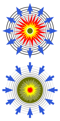 In an explosion (top), force radiates away from a source. With implosion (bottom), the object collapses upon itself (generally being crushed by an outside force).