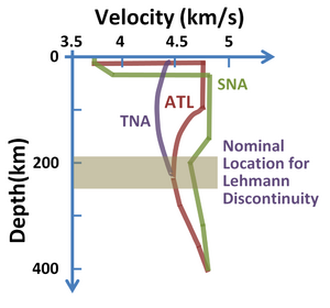 A modern understanding of the Lehmann discontinuity: velocity of seismic S-waves in the Earth near the surface in three tectonic provinces: TNA = Tectonic North America SNA = Shield North America and ATL = North Atlantic.[11]