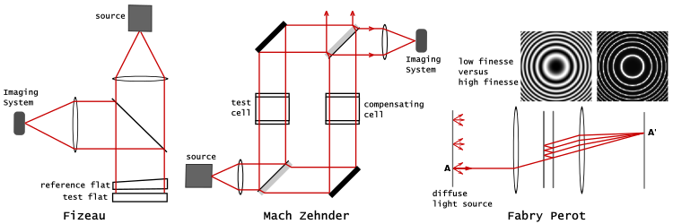 Figure 6. Three amplitude-splitting interferometers: Fizeau, Mach–Zehnder, and Fabry Pérot.