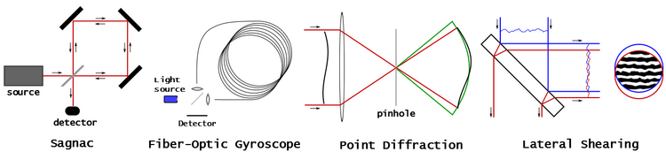 A common-path interferometer is a class of interferometer in which the reference beam and sample beam travel along the same path. Fig. 4 illustrates the Sagnac interferometer, the fibre optic gyroscope, the point diffraction interferometer, and the lateral shearing interferometer. Other examples of common path interferometer include the Zernike phase-contrast microscope, Fresnel's biprism, the zero-area Sagnac, and the scatterplate interferometer.[7]