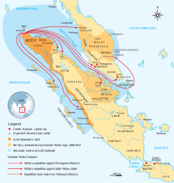 واستمرت حملات اسكندر مودا، مع أنه لم يستطع هزيمة الأسطول البرتغالي عند بينتان في 1614 وفي 1617 قام بغزو بهنج وحمل سلطانها أحمد سياح إلى آتشه، محققًا بذلك موطئ قدم إلى شبه الجزيرة الملاوية.[1] وتبع هذه الغزوة غزو قدح في 1619، التي أصبحت فيها العاصمة خرابًا، وتم جلب الناجين إلى آتشيه.[3] وحصل غزو مماثل لبراق في 1620، عندما أسر 5,000 شخص وتُرِكوا للموت في آتشيه.[2] وقام مجددًا بالهجوم على جوهر في 1623 وأخذ نياس في 5/1624 وعند هذه النقطة هددت قوة آتشيه الاحتلال البرتغالي لـمالاكا. في 1629، أرسل عدة مئات من السفن للهجوم على مالاكا، ولكن المهمة فشلت فشلًا ذريعًا. وطبقًا للمصادر البرتغالية، تم تدمير كل سفنه والقضاء على 19,000 رجل معها. وبعد هذه الخسارة، قام اسكندر مودا بإطلاق حملتين أخريين فقط، في 1/1630 و1634، كلتاهما لإخماد ثورات بهنج. واستطاعت سلطنته إبقاء السيطرة على شمالي سومطرة، ولكن لم يقدر على الفوز بالسيادة في المضيق، أو توسيع السلطنة إلى المنطقة الغنية المنتجة للفلفل لامبونج على الجزء الجنوبي من الجزيرة، والذي كان تحت سيطرة سلطنة بانتين.[4]
