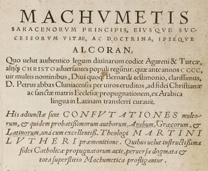 Martin Luther, in his 1528 pamphlet, On War against the Turk, calls for the Germans to resist the Ottoman invasion of Europe, as the catastrophic Siege of Vienna was lurking, but expressed views of Islam which, compared to his aggressive speech against Catholicism (and later Judaism), are relatively mild.[13] Concerned with his personal preaching on divine atonement and Christian justification, he extensively criticized the principles of Islam as utterly despicable and blasphemous, considering Qu'ran as void of any tract of divine truth. For Luther, it was mandatory to let the Qu'ran "speak for itself" as means to show what Christianity saw as a draft from prophetic and apostolic teaching, therefore allowing a proper Christian response. His knowledge on the subject was based on a medieval polemicist version of the Qu'ran made by Riccoldo da Monte di Croce, which was the European scholarly reference of the subject. In 1542, while Luther was translating Riccoldo's Refutation of the Koran, which would become the first version of Koranic material in German, he wrote a letter to Basle's city council to relieve the ban on Theodore Bibliander's translation of the Qu'ran into Latin. Mostly due to his letter, Bibliander's translation was finally allowed and eventually published in 1543, with a preface made by Martin Luther himself. With access to a more accurate translation of the Qu'ran, Luther understood some of Riccoldo's critiques to be partial, but nevertheless concurred with virtually all of them.[14]