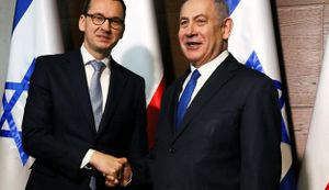 رئيس الوزراء الپولندي، ماتيوش مورڤسكي يصافح نظيره الإسرائيلي بنيامين نتانياهو أثناء مؤتمر وارسو 2019.
