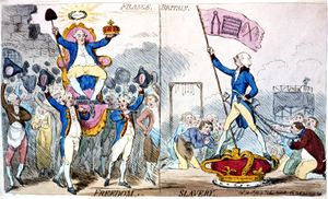 في فرنسا. بريطانيا. الحرية. العبودية (1789)، جيمس گيلراي يسخر بالكاريكاتير من انتصار نكير (الجالس، إلى الشمال) في 1789، مقارناً باستهزاء أثرها على الحرية بأثر پـِت في إنگلترة.
