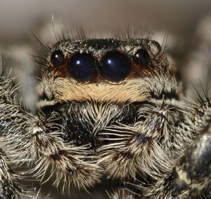 The jumping spiders, unlike the other families, have faces that are roughly rectangular surfaces perpendicular to their direction of motion. In effect this means that their forward-looking, anterior eyes are on "flat faces", as shown in the photographs. Their eye pattern is the clearest single identifying characteristic. They have eight eyes, as illustrated.[3][4] Most diagnostic are the front row of four eyes, in which the anterior median pair are more dramatically prominent than any other spider eyes apart from the posterior median eyes of the Deinopidae. There is, however, a radical functional difference between the major (AME) eyes of Salticidae and the major (PME) eyes of the Deinopidae; the large posterior eyes of Deinopidae are adapted mainly to vision in dim light, whereas the large anterior eyes of Salticidae are adapted to detailed, three-dimensional vision for purposes of estimating the range, direction, and nature of potential prey, permitting the spider to direct its attacking leaps with great precision. The anterior lateral eyes, though large, are smaller than the AME and provide a wider forward field of vision.
