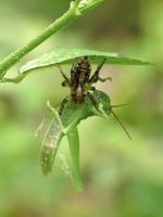 Jumping spiders conduct complex, visual courtship displays using both movements and physical bodily attributes. Unlike females, males possess plumose hairs, colored or iridescent hairs (particularly pronounced in the peacock spiders), front leg fringes, structures on other legs, and other, often bizarre, modifications. These characteristics are used in a courtship "dance" in which the colored or iridescent parts of the body are displayed. In addition to the display of hairs, jumping spiders perform complex sideling, vibrational, or zigzag movements to attract females. If receptive to the male, the female will assume a passive, crouching position. It has also recently been discovered that many males have auditory signals as well. These amplified sounds presented to the females resemble buzzes or drum rolls.[9] In some species, the female may also vibrate her palps or abdomen. The male will then extend his front legs towards the female to touch her. If the female remains receptive, the male will climb on the female's back and inseminate her with his palps.[10]