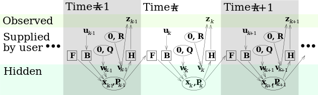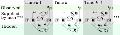 يفترض نموذج مرشح كالمان أن الحالة الحقيقية عند الزمن k قد تطورت من الحالة عند (k − 1) حسب