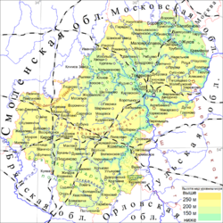Kaluga Oblast lies in the central part of the East European Plain. The oblast's territory is located between the Central Russian Upland (with and average elevation of above 200 متر (660 ft) and a maximum elevation of 275 متر (902 ft) in the southeast), the Smolensk–Moscow Upland and the Dnieper–Desna watershed. Most of the oblast is occupied by plains, fields and forests with diverse flora and fauna. The administrative center is located on the Baryatino-Sukhinichy plain. The western part of the oblast — located within the drift plain — is dominated by the Spas-Demensk ridge. To the south is an outwash plain that is part of the Bryansk-Zhizdra woodlands, with average elevation up to 200 m.