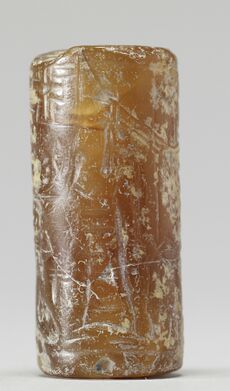 The glyptic themes experienced various evolutions during the second half of the second millennium BC, which experts divide into three or four types but whose chronology and geographical distribution are still poorly determined. The type of seal that predominated at the beginning took up the tradition of the preceding period; it associates a seated and a praying deity, with the text accompanying the image, very developed, consisting of a votive prayer; the engraved material is generally a hard stone. The next type of the kassite period is more original; a central character is depicted, often a kind of kthonic figure, a god on a mountain or emerging from the waters, or a hero, a demon, or trees surrounded by genies. The third kassite type is characterized by Assyrian influences and the presence of real or hybrid animals. The later style (also called "pseudo-Kassite"), developed at the end of the Kassite period or shortly thereafter, was engraved on soft stones and the images were dominated by animals associated with trees and framed with friezes of triangles.[87][88][89][90]