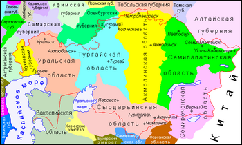 NTD of the area along ethnic lines had been proposed as early as 1920.[9][10] During Tsarist times the general area of modern Kazakhstan was composed of four regions (oblasts); west-to-east these were Ural (plus part of Transcaspian Oblast, Turgai, Akmolinsk and Semipalatinsk. All four oblasts had been created by a Decree of Tsar Alexander II of 21 October (2 November) 1868.[11] On 26 August 1920 the Kirghiz Autonomous Socialist Soviet Republic (KASSR, located within the Russian Soviet Federative Socialist Republic, RSFSR) was created from these four provinces (briefly joined together in this period in the short-lived Alash Autonomy), with the northern border of the ASSR essentially following that of the former four oblasts, though adjusted in places to reflect local demographics; however, disputes over specific areas of the boundary continued into the following year.[12] At this time Kazakhs were referred to as "Kyrgyz" and what are now the Kyrgyz were deemed a sub-group of the Kazakhs and referred to as "Kara-Kyrgyz" (i.e. mountain-dwelling black-Kyrgyz).[13][14] The areas west of the Ural river associated with the Kazakh Bukey Horde were claimed by both the KASSR and Astrakhan Oblast, with most of the area going to the KASSR in 1921, including Kurmangazy and Sinemorsk.[15] Elsewhere, some Russian-inhabited areas of the four oblasts, such as Omsk, were transferred to Russia.[16][17][15]