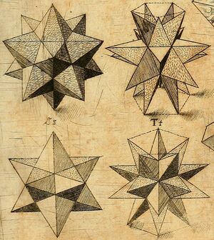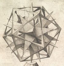 In his Perspectiva corporum regularium (Perspectives of the regular solids), a book of woodcuts published in 1568, Wenzel Jamnitzer depicts the great stellated dodecahedron and a great dodecahedron (both shown below). There is also a truncated version of the small stellated dodecahedron.[8] It is clear from the general arrangement of the book that he regarded only the five Platonic solids as regular.